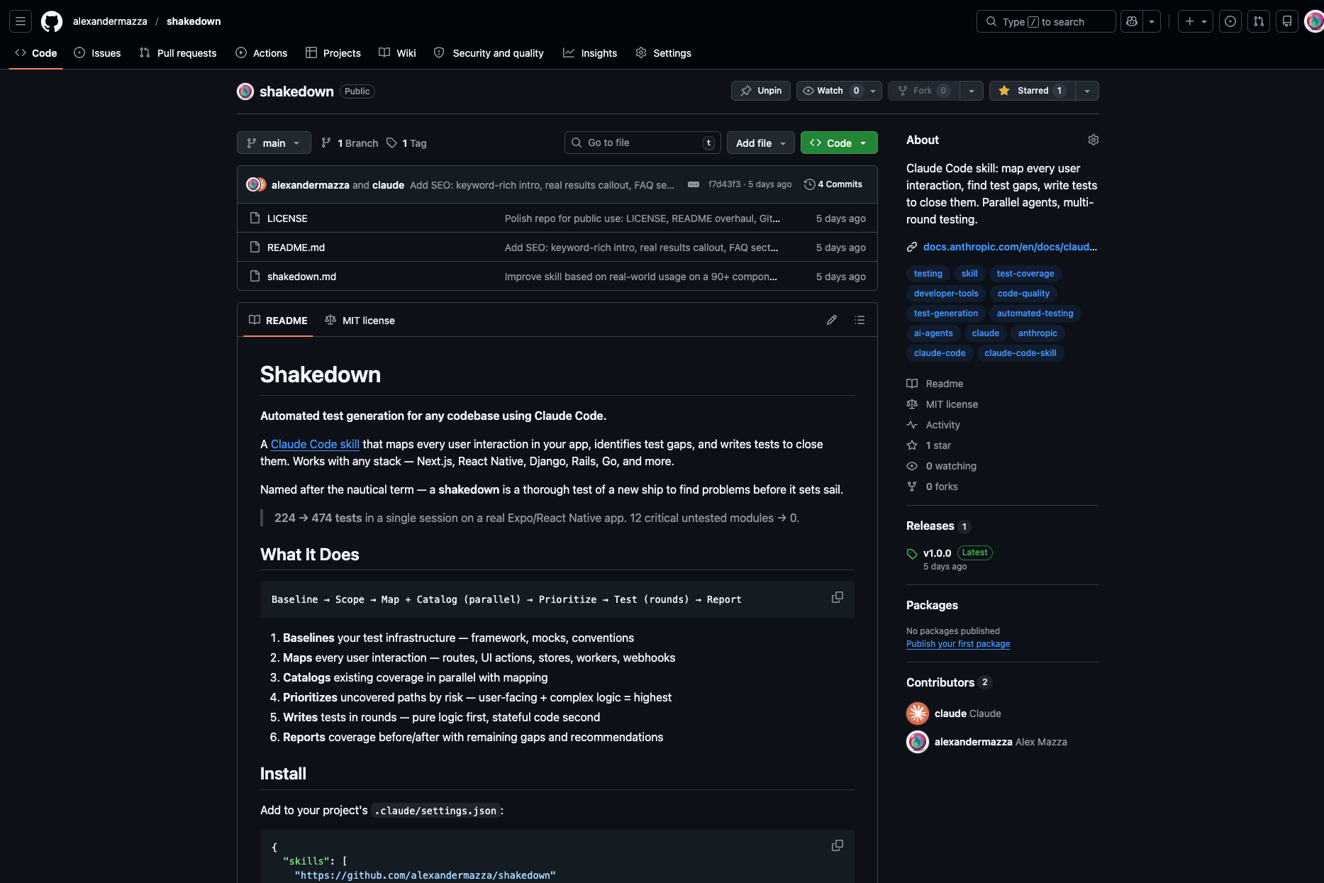 Shakedown systematically maps every user interaction, catalogs existing coverage, prioritizes uncovered paths by risk, and dispatches 3-5 parallel agents to write tests in rounds — pure functions first, then stateful code with mocking.Works with any stack including Next.js, React Native, Django, Rails, and Go.Named after the nautical term for a thorough test of a new ship — took a real Expo app from 224 to 474 tests in a single session.